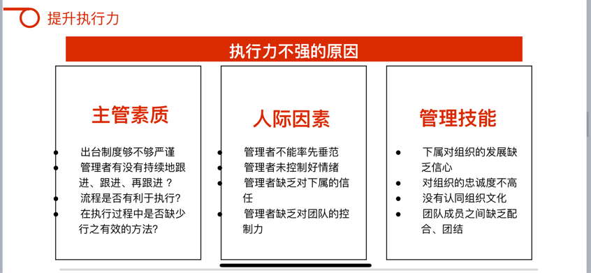 生動(dòng)形象地幫助大家建立了對(duì)執(zhí)行力的結(jié)構(gòu)化認(rèn)知,更進(jìn)一步理解到了工作態(tài)度、工作職責(zé)、工作任務(wù)、工作結(jié)果的邏輯聯(lián)系,以及如何在強(qiáng)化執(zhí)行力的同時(shí),提高部門運(yùn)作效率,使效能與效率相輔相成,創(chuàng)造出更高的部門績(jī)效。